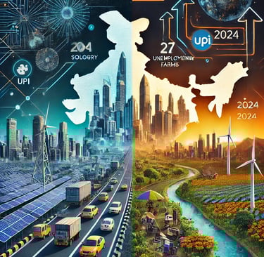 **India: Booming or Dooming?** India is thriving as the world’s 5th-largest economy with rapid innovations like UPI and startups like Practo and DeHaat. Yet, challenges persist—unemployment, a manufacturing lag, and social divides. While government policies spark growth, India’s transformation hinges on collective effort and awareness.
